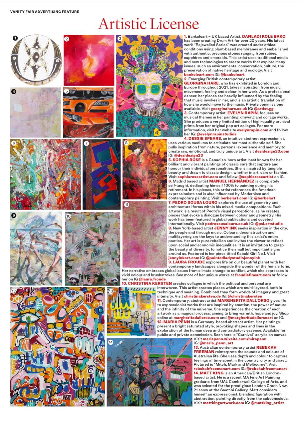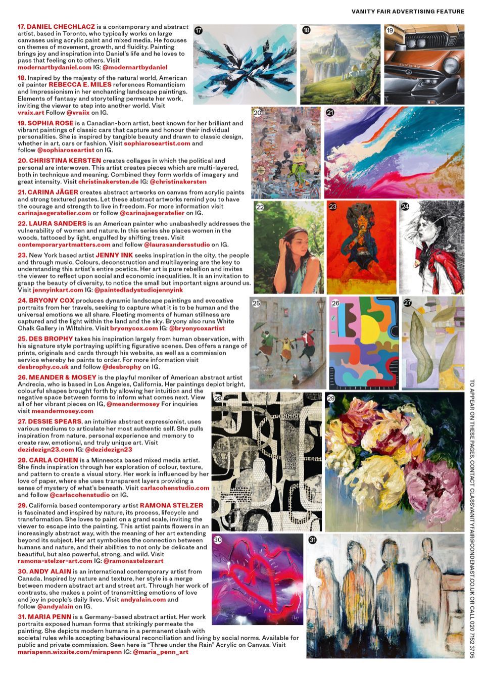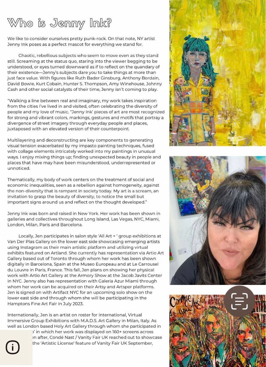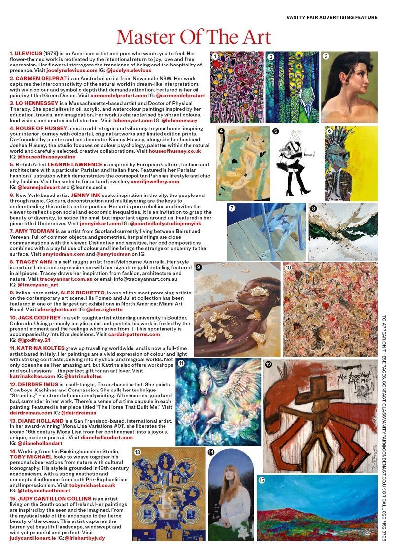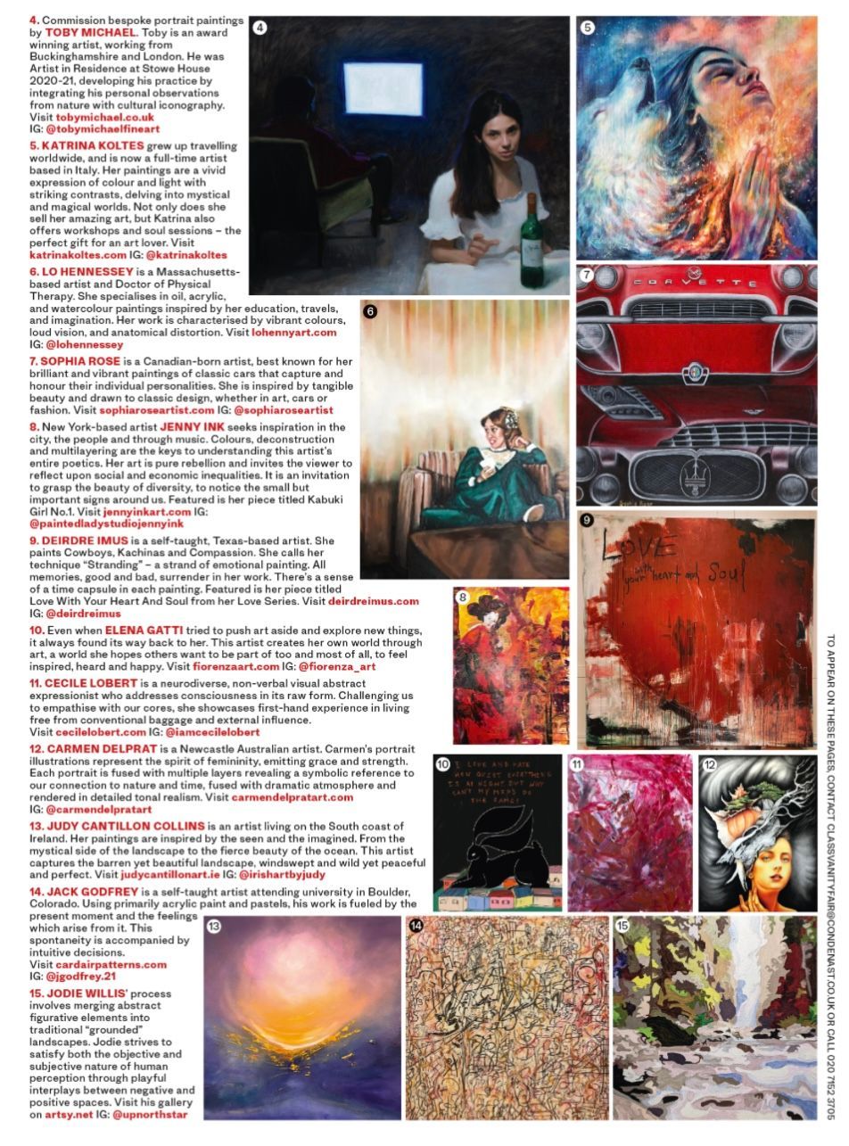 Last summer, Jen participated in a virtual group exhibition with the Holy.Art Gallery; 'Art On Loop'; displayed on 160+ screens across London. Soon after, Condé Nast /Vanity Fair UK reached out and Fall (2022) Jen was 1 of 20 artists, to have work in the 'Artistic License' feature of Vanity Fair UK September, October and November 2022 issues... & the February 2023 Issue as well.