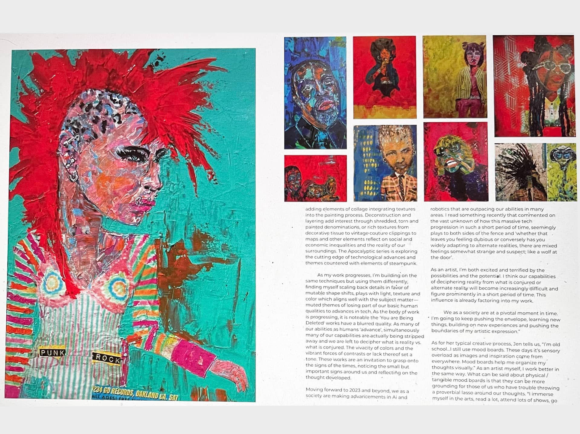 "NY based mixed media artist recognized for her impasto painting style in which abstraction and urban portraiture are fused with multi layering and deconstructive techniques to switch up usual appearances in unusual ways; full of contrasts, street imagery & pure rebellion."